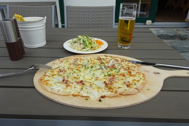 Der köstliche Flammkuchen mit Beilage im Gasthaus „Im Einklang“