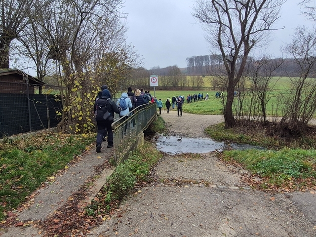 Im Gänsemarsch über den Steg über den Mödlingbach...