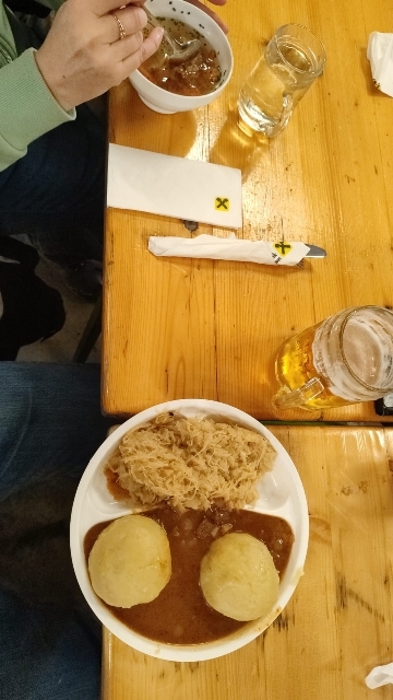 Fleischknödel mit Kraut und Gulaschsaft