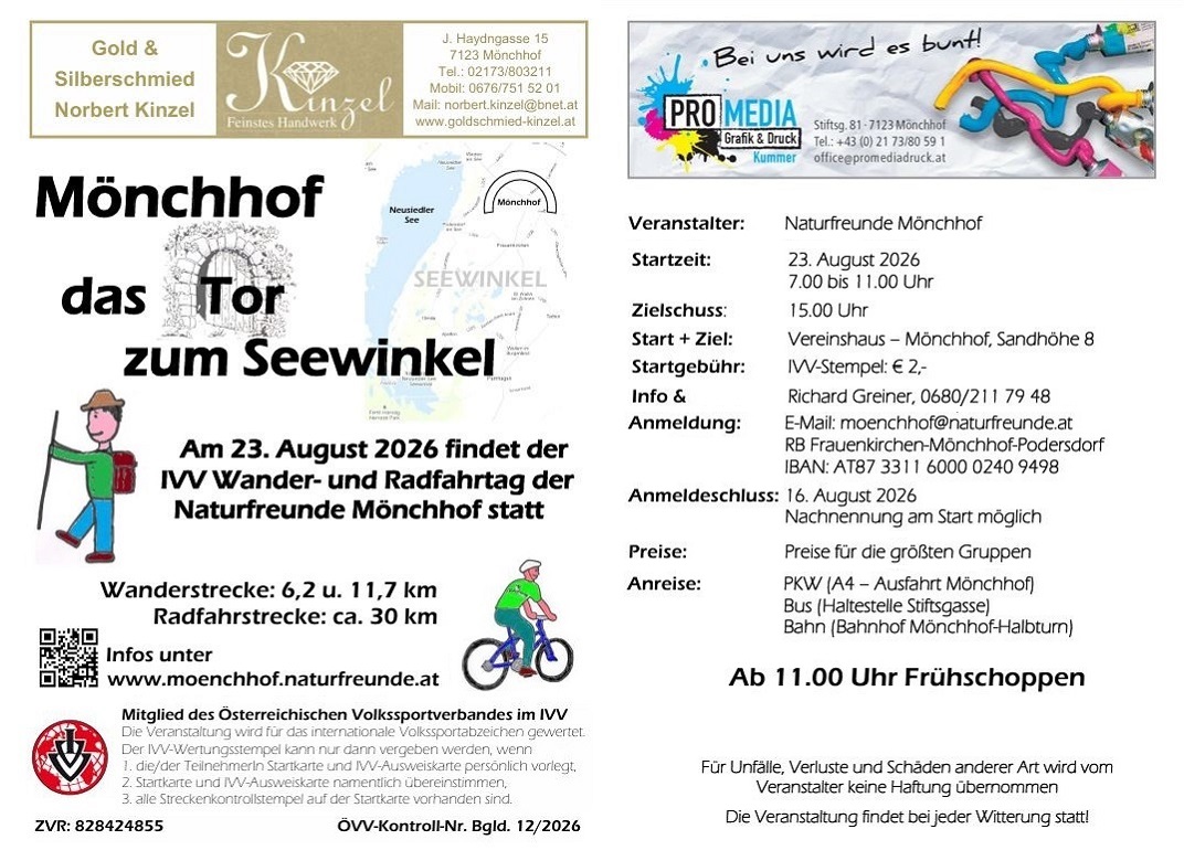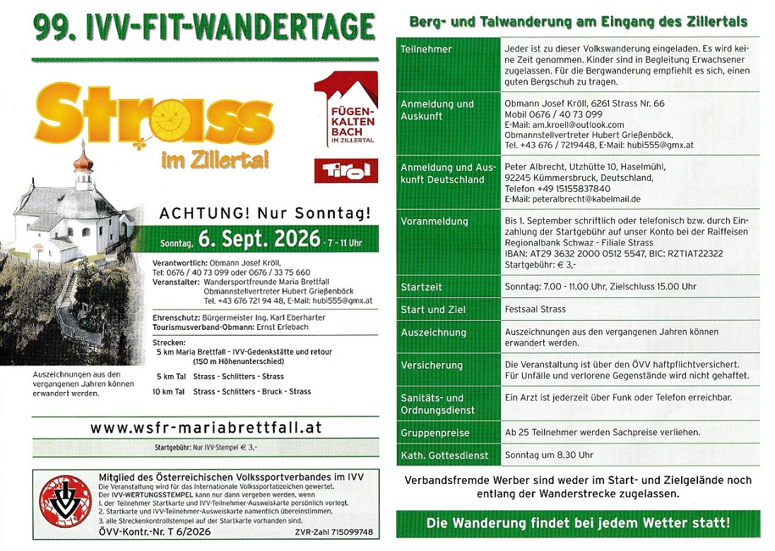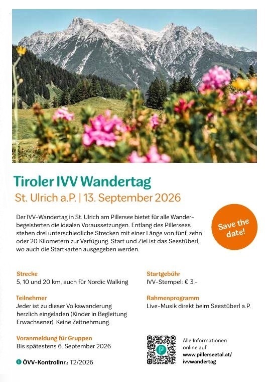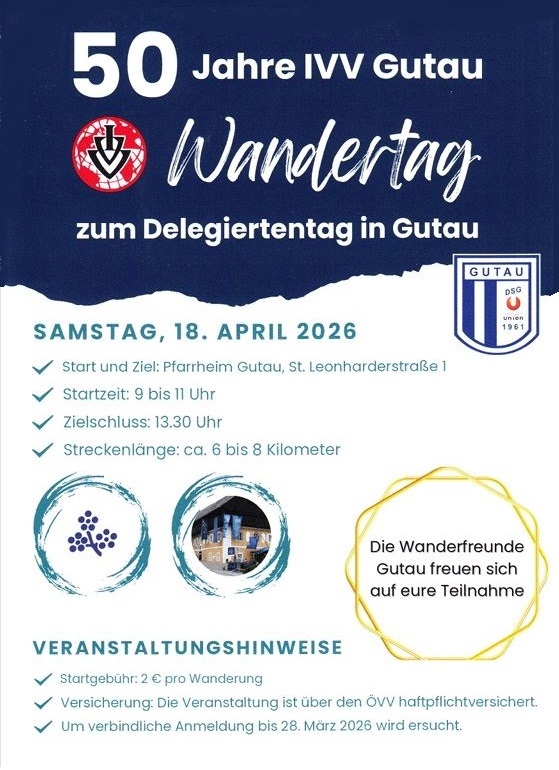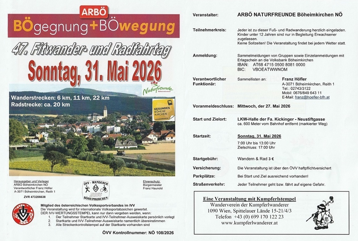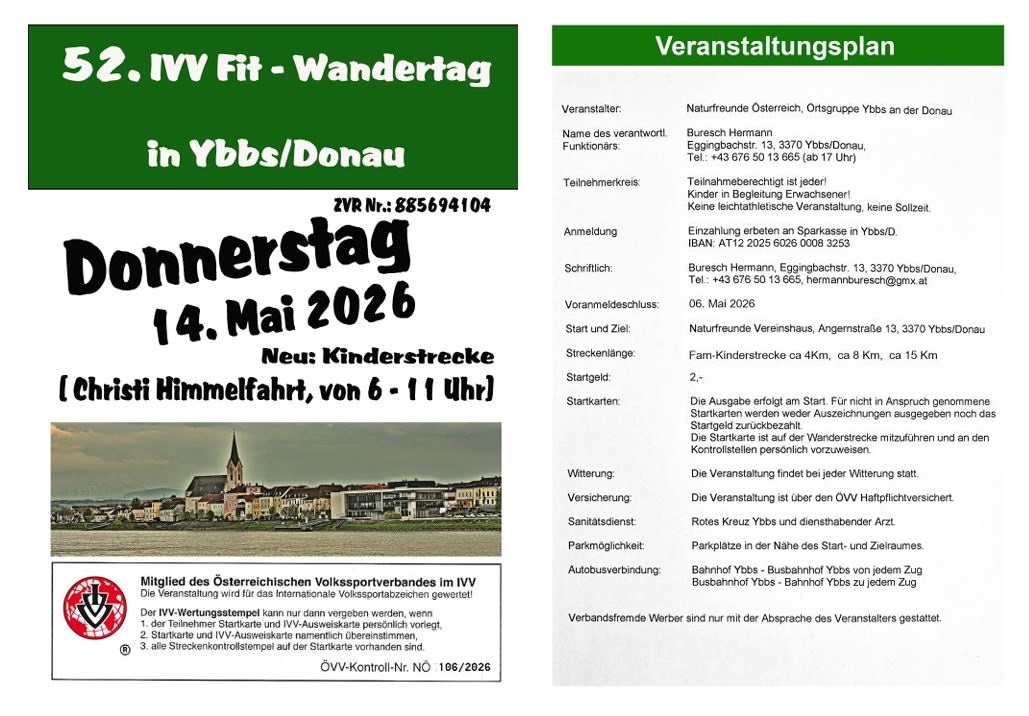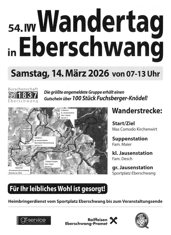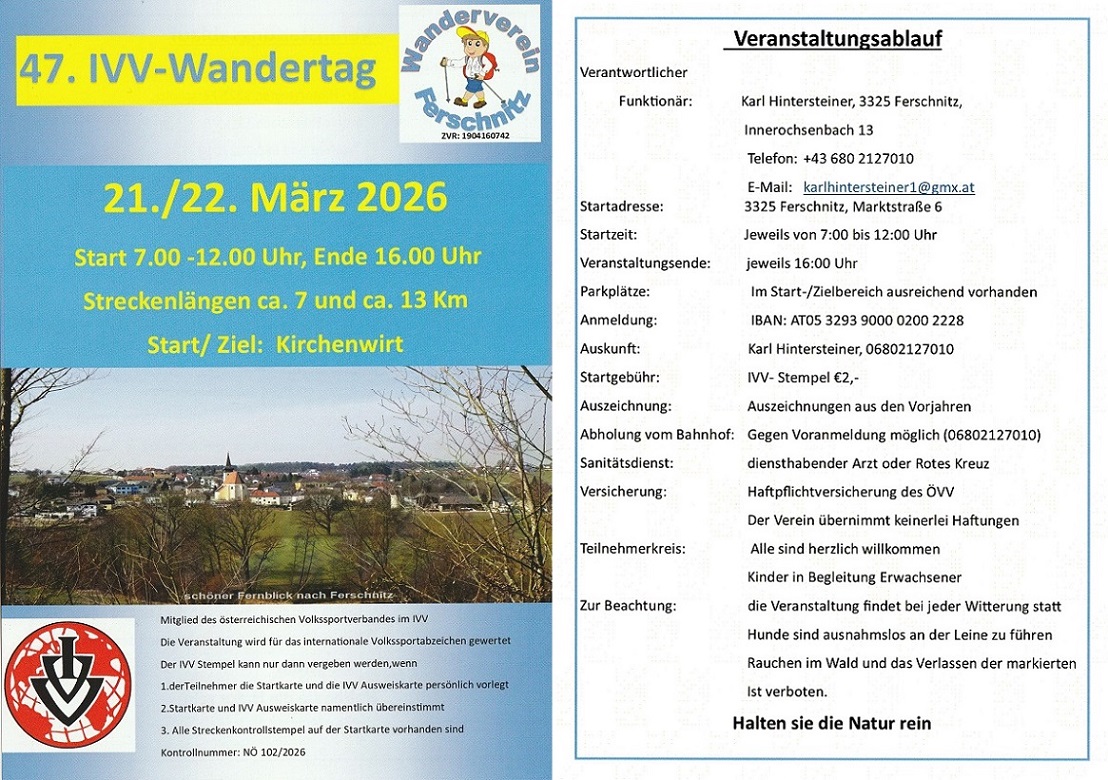 7 km + 13 km Start von 7 - 12 Uhr Zielschluss: 16 Uhr Startort: Kirchenwirt - Gasthaus Affengruber Marktstraße 6 3325 Ferschnitz Start zur gemeinsamen Wanderung: Sonntag, 22.03.2026 um 8:30 Uhr |