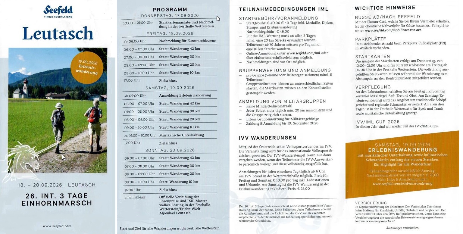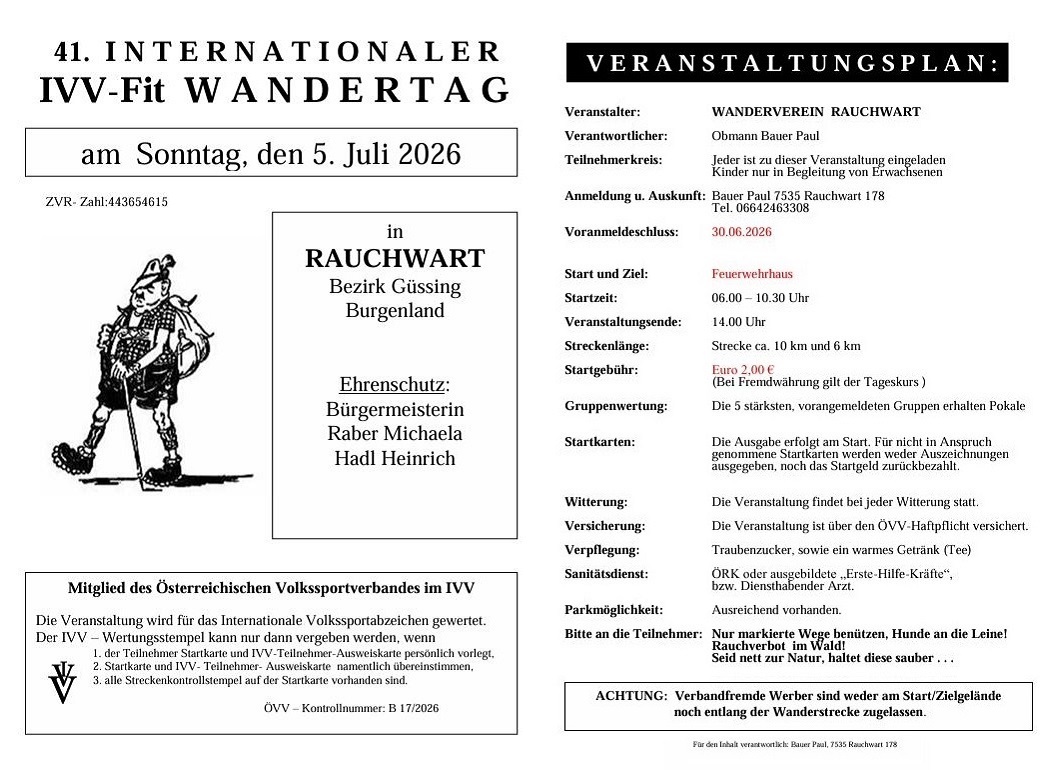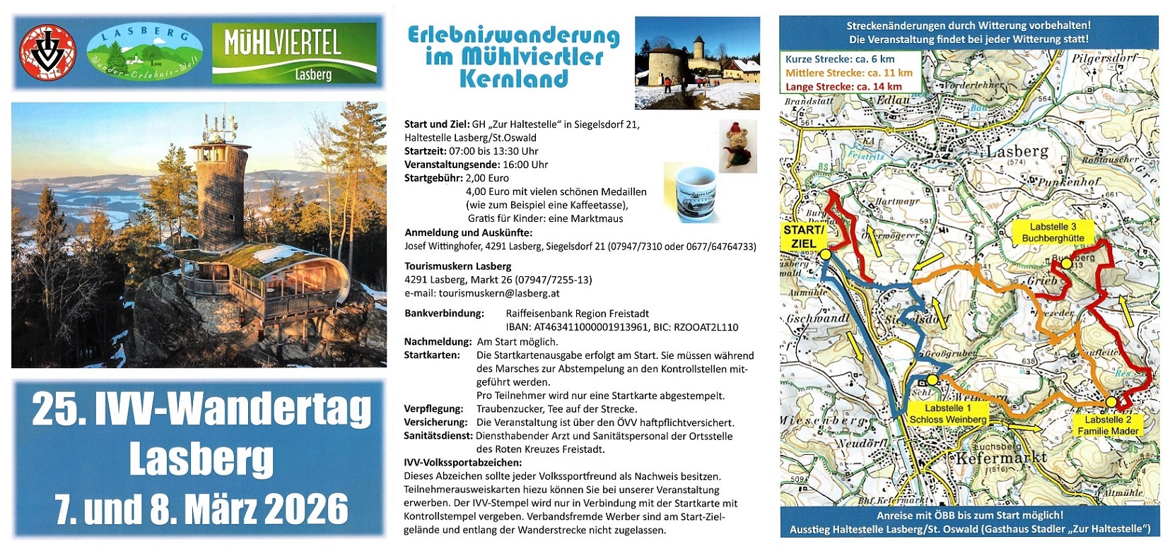 Marktgemeinde Rappottenstein Freiwillige Feuerwehr Lembach mit Unterstützung der Wanderfreunde Traunstein-Salzkammergut Samstag, 03.10.2026: mind. 3 Strecken zwischen 5 und 30 km Start von 7 - 12 Uhr - Ziel: 18 Uhr 42 km Wald¼-Hochland-WanderMarathon + 50 km Wald¼-Hochland-50er Start von 6:30 - 8 Uhr - Ziel: 19 Uhr Sonntag, 04.10.2026: mind. 3 Strecken zwischen 5 und 30 km Start von 7 - 12 Uhr - Ziel: 18 Uhr Startort: Anwesen Familie Binder 3911 Lembach 3 |