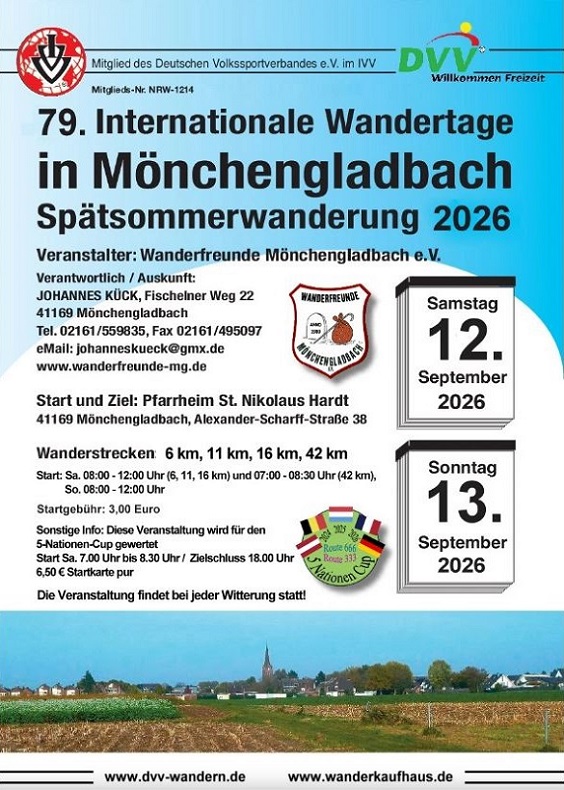 8. Europiade Donnerstag, 11.06.2026 - "Eifeltag" Wandern: 5 km + 10 km + 20 km - Start von 8 - 14 Uhr Radfahren: 25 km + 50 km - Start von 8 - 14 Uhr Zielschluss: 17 Uhr Freitag, 12.06.2026 - "Ardennentag" Wandern: 42 km - Start von 7 - 9 Uhr Wandern: 5 km + 10 km + 23 km - Start von 7 - 14 Uhr Radfahren: 25 km + 50 km - Start von 8 - 14 Uhr Schwimmen: 200m oder 500m (Hallenbad) Start von 8 - 11 Uhr und 15 - 17 Uhr Zielschluss: 17 Uhr Samstag, 13.06.2026 - "Venntag" Wandern: 42 km + 50 km - Start von 6 - 9 Uhr Wandern: 5 km + 11 km + 20 km - Start von 7 - 14 Uhr Schwimmen: 200m oder 500m (Hallenbad) Start von 8 - 11 Uhr und 15 - 17 Uhr Zielschluss: 17 Uhr Abschlusszeremonie um 18 Uhr Startort: Sport- und Ferienpark Worriken Worriken 9 4750 Bütgenbach Belgien |